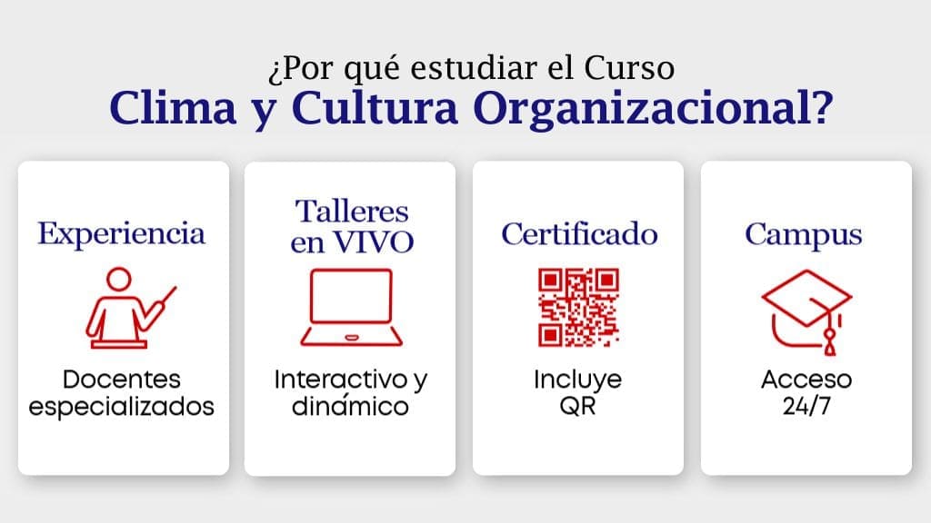 Fortalece tu perfil en la gestión estratégica del entorno laboral. Con nuestro Curso Integrado en “Clima y Cultura Organizacional” desarrollarás competencias para diagnosticar brechas culturales, medir el engagement e implementar estrategias que consoliden una cultura orientada a resultados, impulsando el compromiso y la sostenibilidad organizacional.